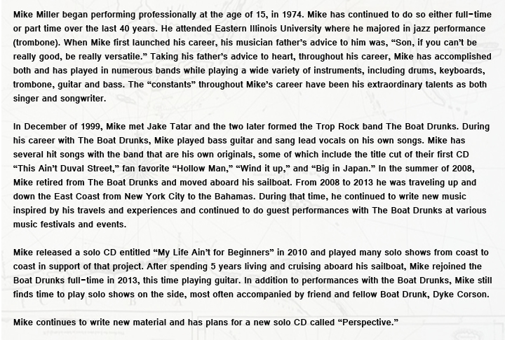 The Boat Drunks' CD can be purchased on their website at www.boatdrunks.com and also at CD Baby. Mike's solo CD available on this website or at CD Baby.